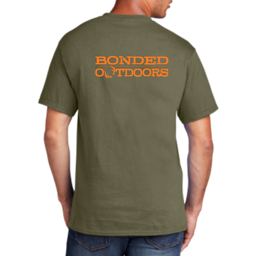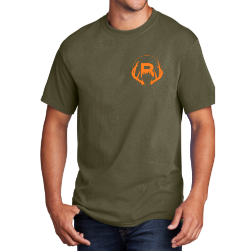 Our Olive Green T-shirt features our Duke logo on the left chest and our name logo across the back in orange print.